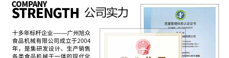廣州旭眾食品機(jī)械有限公司是一家集科研開(kāi)發(fā),生產(chǎn)設(shè)計(jì),營(yíng)銷服務(wù)為一體的現(xiàn)代化生產(chǎn)企業(yè)?,F(xiàn)代化生產(chǎn)車間,精湛制造技術(shù),所產(chǎn)機(jī)械歷經(jīng)市場(chǎng)重重考驗(yàn),不斷贏得海內(nèi)外客戶的贊譽(yù)。