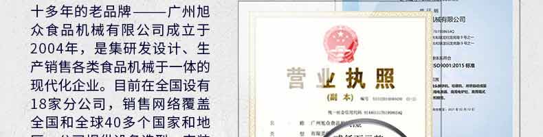 廣州旭眾食品機(jī)械有限公司是一家集科研開(kāi)發(fā),生產(chǎn)設(shè)計(jì),營(yíng)銷(xiāo)服務(wù)為一體的現(xiàn)代化生產(chǎn)企業(yè)?,F(xiàn)代化生產(chǎn)車(chē)間,精湛制造技術(shù),所產(chǎn)機(jī)械歷經(jīng)市場(chǎng)重重考驗(yàn),不斷贏得海內(nèi)外客戶(hù)的贊譽(yù)。