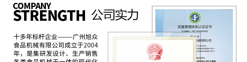 廣州旭眾食品機(jī)械有限公司是一家集科研開(kāi)發(fā),生產(chǎn)設(shè)計(jì),營(yíng)銷(xiāo)服務(wù)為一體的現(xiàn)代化生產(chǎn)企業(yè)?,F(xiàn)代化生產(chǎn)車(chē)間,精湛制造技術(shù),所產(chǎn)機(jī)械歷經(jīng)市場(chǎng)重重考驗(yàn),不斷贏得海內(nèi)外客戶的贊譽(yù)。