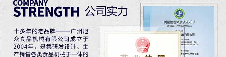 廣州旭眾食品機(jī)械有限公司是一家集科研開發(fā),生產(chǎn)設(shè)計(jì),營(yíng)銷服務(wù)為一體的現(xiàn)代化生產(chǎn)企業(yè)?,F(xiàn)代化生產(chǎn)車間,精湛制造技術(shù),所產(chǎn)機(jī)械歷經(jīng)市場(chǎng)重重考驗(yàn),不斷贏得海內(nèi)外客戶的贊譽(yù)。
